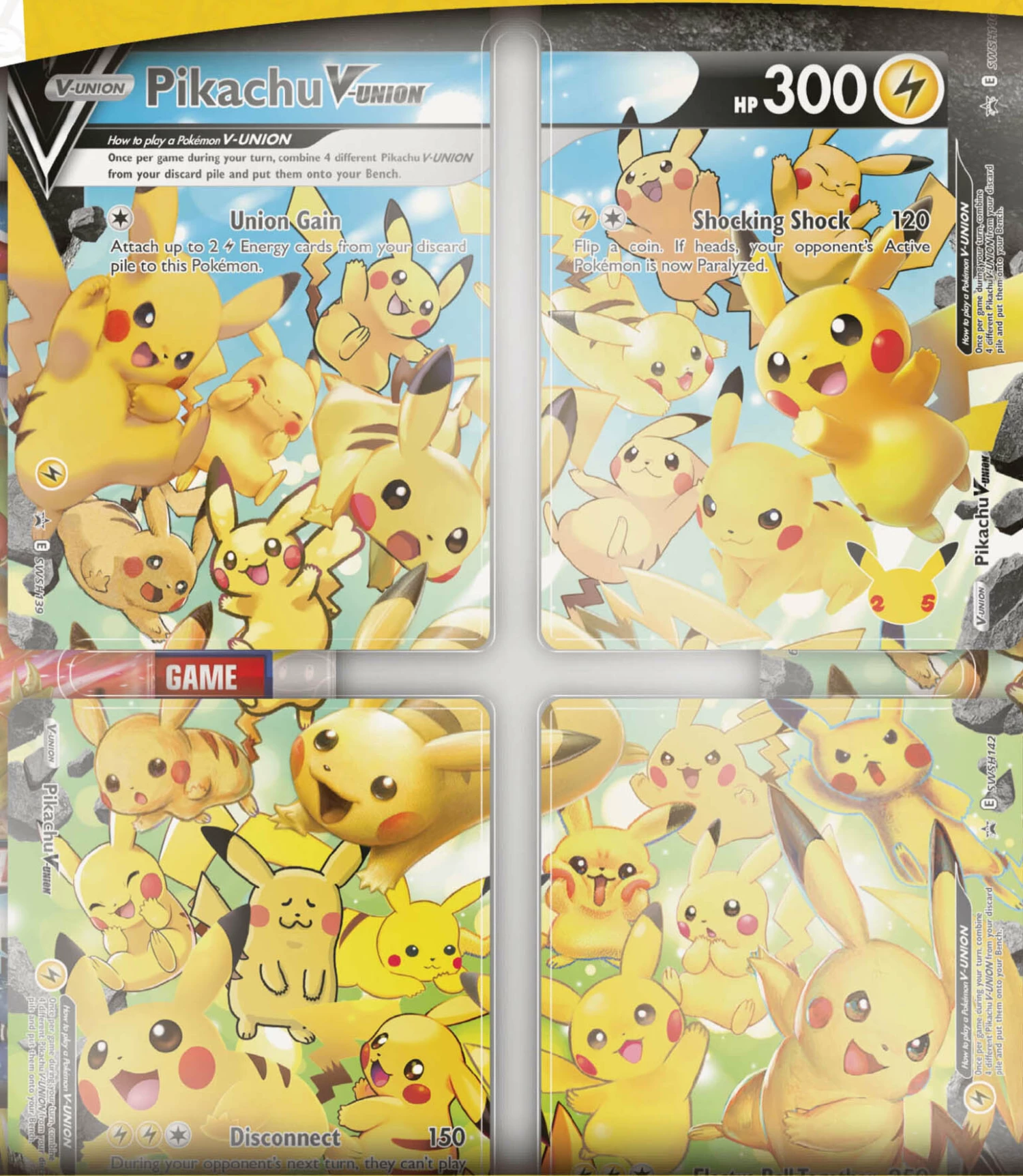 4 foil promo cards that make up a single Pikachu V-UNION