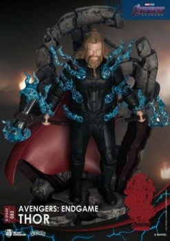 The D-Stage-082 sees Thor ready to charge Thanos and his minions with the might of both the Mjolnir hammer and his Stormbreaker axe in both hands. Lightning effects engulf his body as he prepares for the final showdown! Also set against the backdrop of a fallen Avengers logo the stakes had never been this high. The D-Stage Thor is a perfect diorama for fans of the mightiest god to grace our screens!