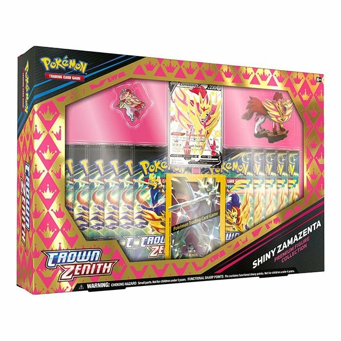 The Pokémon TCG: Crown Zenith – Shiny Zacian / Zamazenta Premium Figure Collection is a remarkable way to commemorate the conclusion of the beloved Sword and Shield era in the game. This collection highlights the powerful Shiny forms of Zacian and Zamazenta across various exciting items. Here’s what you can expect from this premium collection: